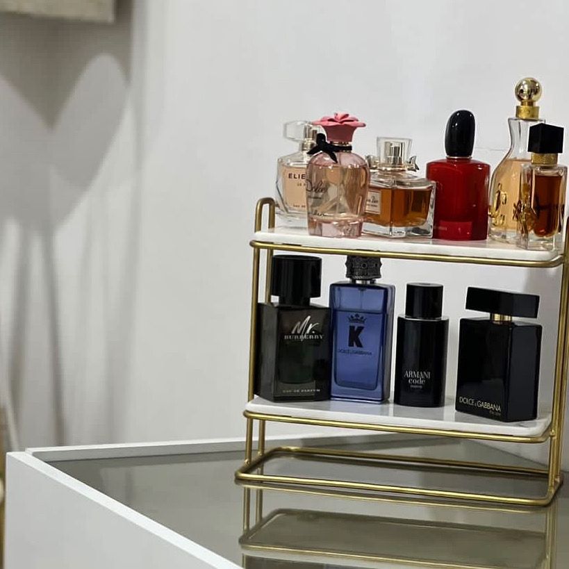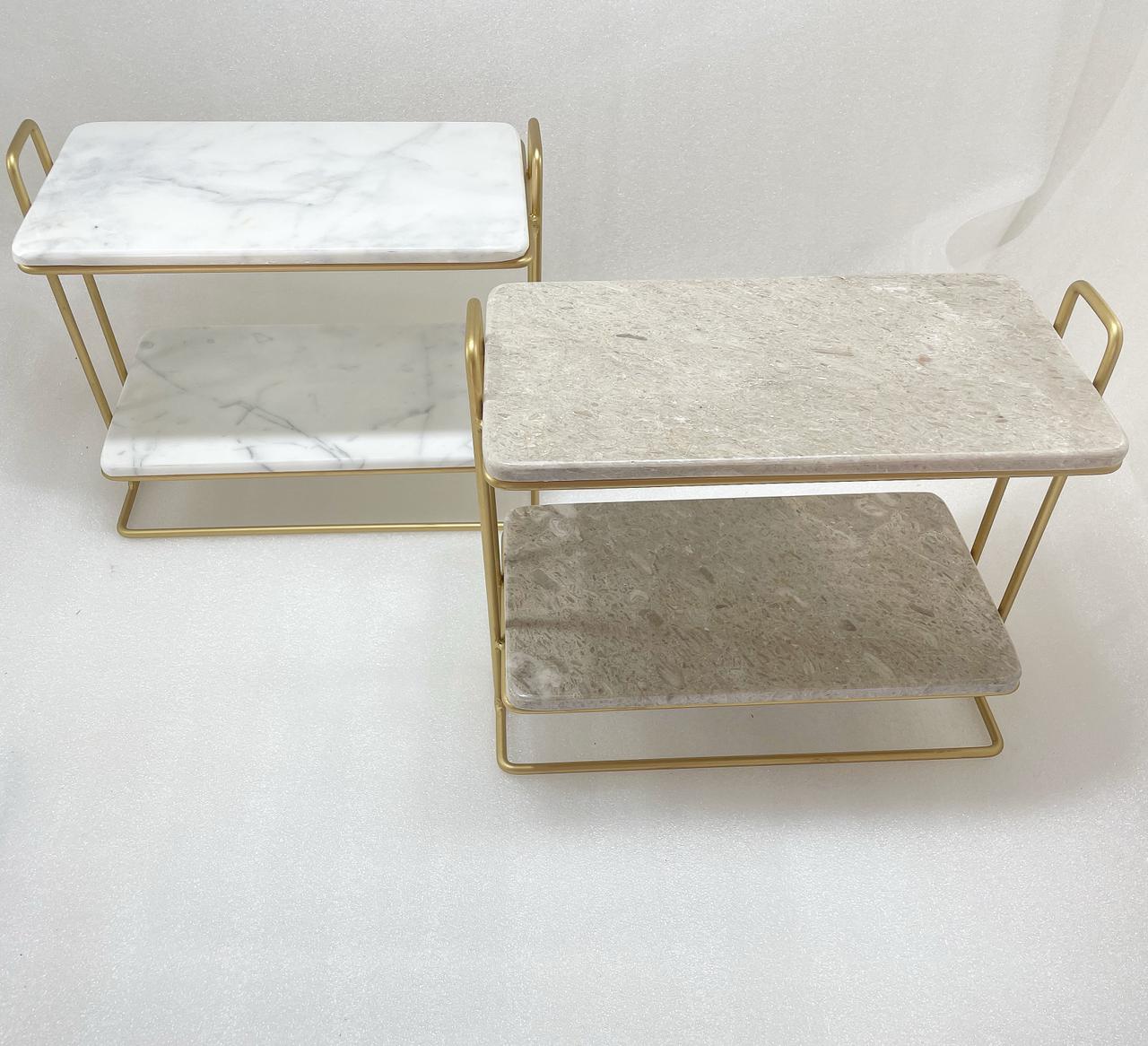 Donnez une touche d'élégance à votre intérieur avec notre étagère rectangulaire en marbre et métal à deux étages. Idéale pour ranger vos objets de décoration ou vos parfums préférés, elle ajoutera une touche sophistiquée à n'importe quel espace. Le mariage du marbre et du métal apporte une beauté intemporelle à cette pièce de mobilier.